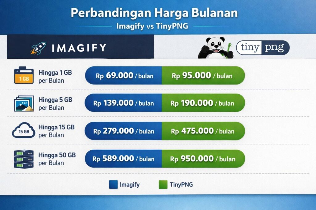 TinyPNG gratis 500 compressions per bulan. Bayar $0,009 per compression di atasnya. Imagify gratis 20 MB per bulan (sekitar 200 gambar standar). Paid plan mulai dari $4,99/bulan untuk 500 MB.
