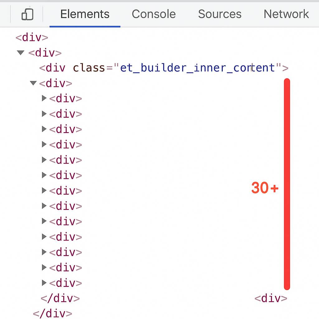 Divi Builder menghasilkan markup HTML yang sangat bertingkat. Elemen sederhana seperti tombol bisa dibungkus dalam 7-10 level div. Pada landing page kompleks dengan 50+ modul, depth DOM bisa mencapai level 30-40.